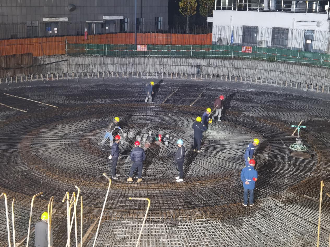 初冬的夜晚已是寒风凛冽,而在施工现场,工人们正在紧锣密鼓地对二沉池底板进行着混凝土浇筑施工。本次浇筑的二沉池底板混凝土,方量为820m3,需要连续浇筑、一次成型,浇筑于11月24日上午6点30分开始,次日凌晨4点结束。连续作业中,高达十多米的泵车,将搅拌车上的混凝土浇筑到二沉池底板的不同位置,项目部施工员桂志强、安全员吴运祥等人一直坚守在自己的岗位上,引导泵车导管向底板浇筑着混凝土。灯光的照耀下,大家干劲十足,忙碌不停,有的在检查预埋管道位置,有的忙着对刚浇筑的混凝土振捣密实,整个施工现场忙而不乱,井井有条争分夺秒,奋力推进工程建设