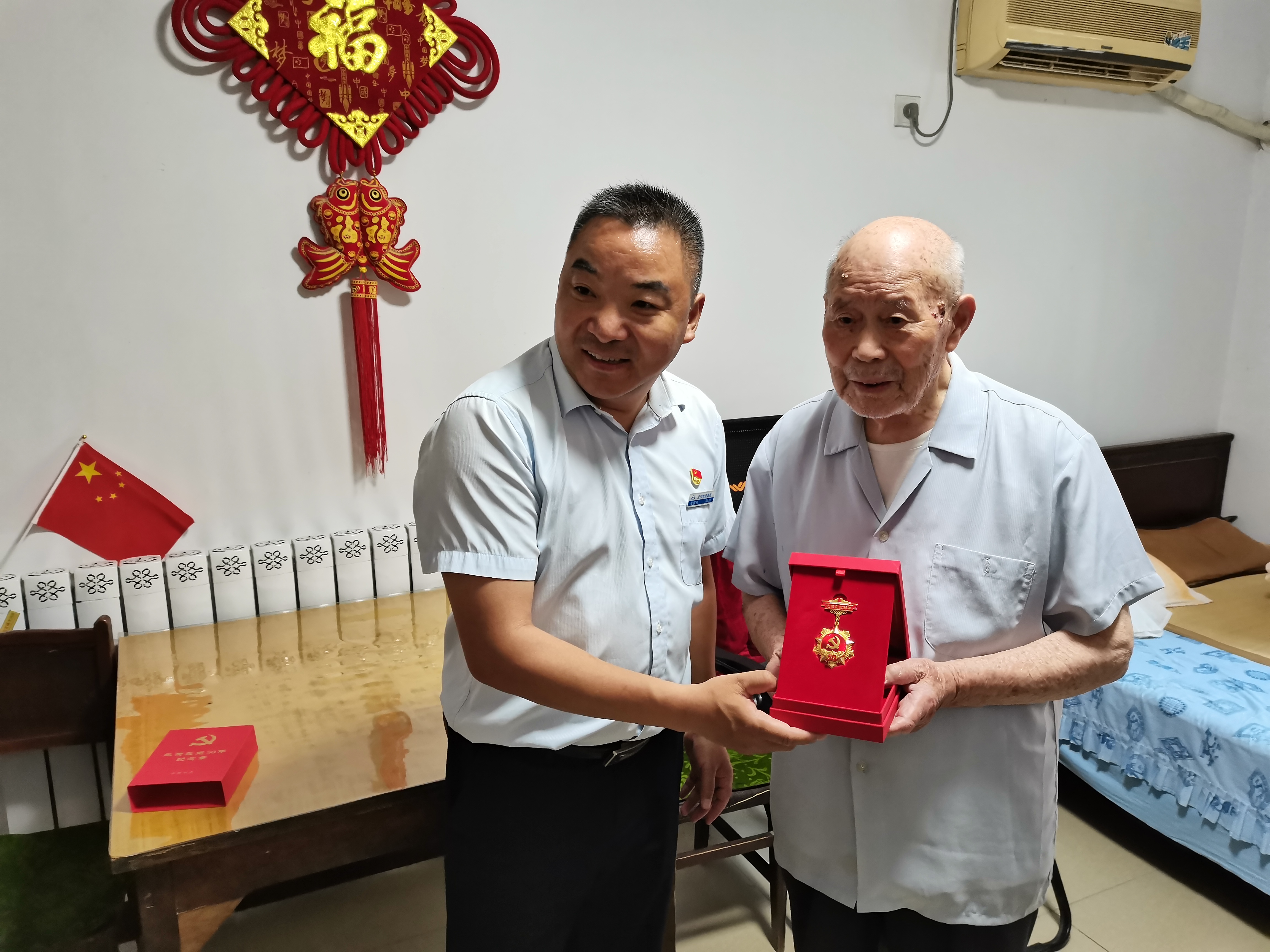 在王老家中,张国兴详细询问了他的身体状况及生活情况,为他颁发“光荣在党50年”纪念章,并送上鲜花和慰问金,提前致以节日的诚挚问候和美好祝福。