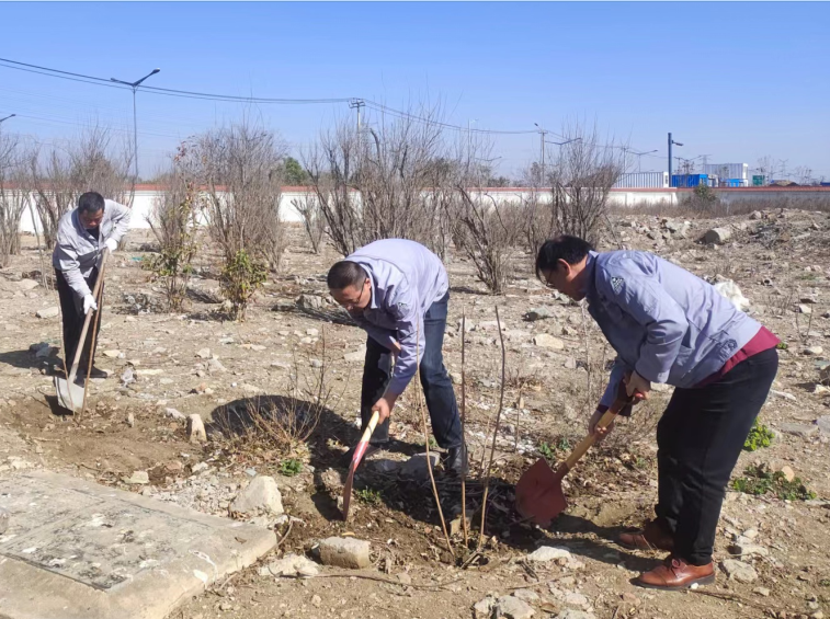 活动中,员工们手持铁锹,干劲十足,齐心协力将一棵棵充满生机和希望的树苗植入土中,挖土、摆苗、填土、浇水,不一会功夫,一排整齐的小树苗在春风中摇曳。