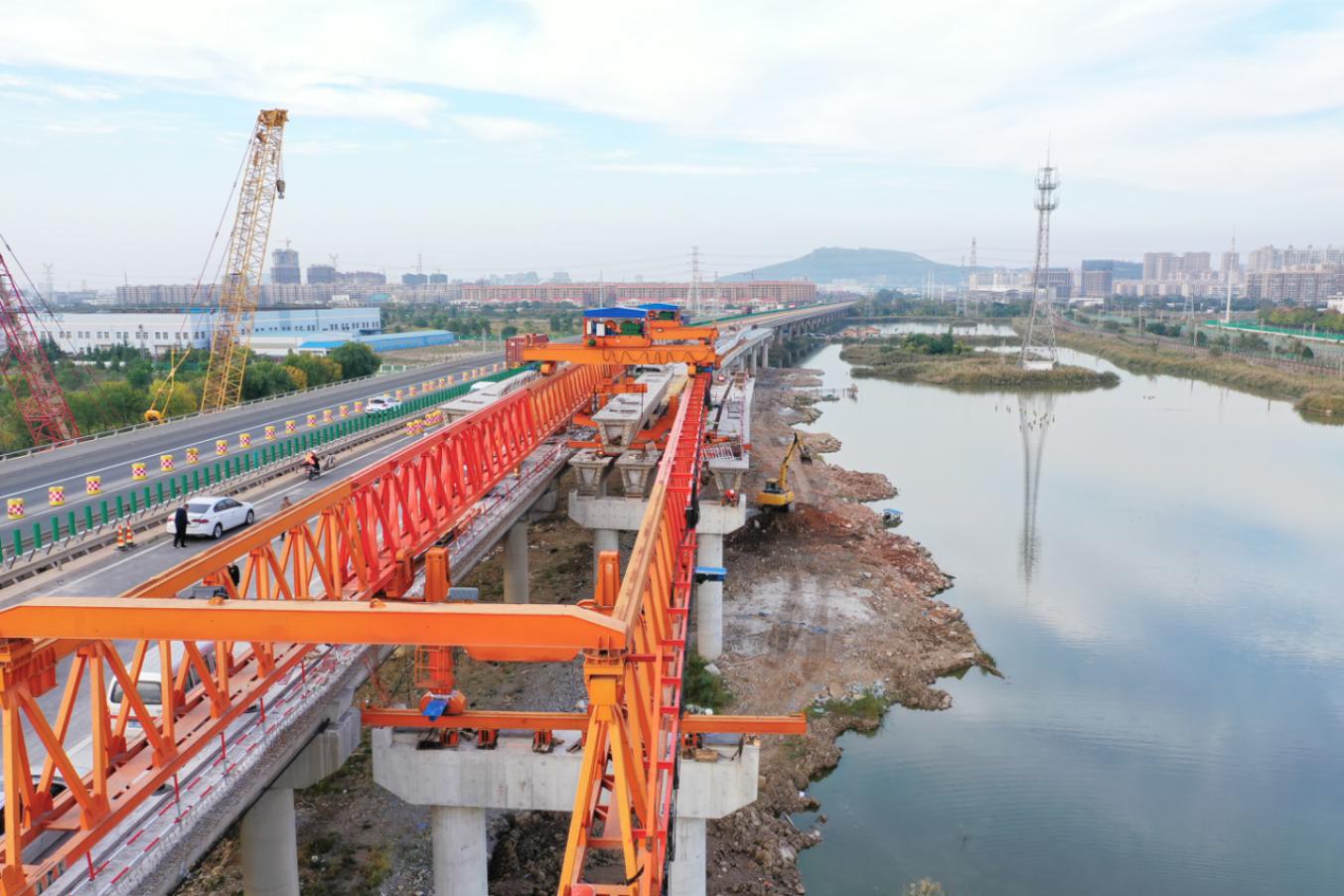 主桥左右幅拼宽段共需架设箱梁60片,其中左右幅主桥各架设30片,目前左半福已经完成架梁22片。因与D匝道连接架设场地靠近鱼塘,架梁面积极其狭窄,为了确保年底建成这一工期目标,交通千亿app最新版下载,千亿(中国)组织参建单位多次研究细化施工方案,克服施工困难,采用履带起吊机和架桥机两种架设方式组合,缩短架梁施工周期。