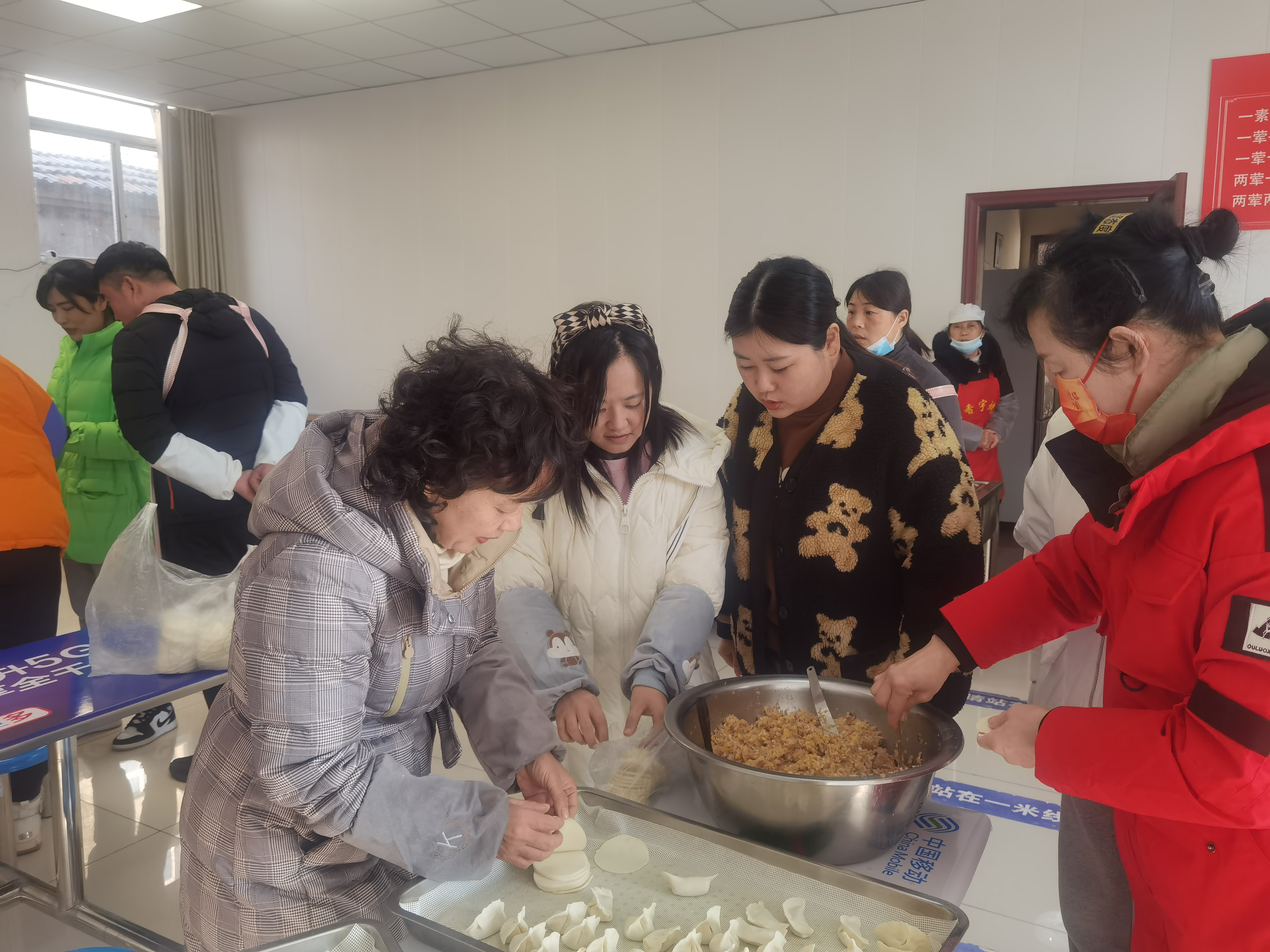 包饺子活动中,大家一起擀皮、包饺子分工有序,忙而不乱,边说边干,互相切磋包饺子的技巧,活动现场热闹非凡。很快,在大家的积极参与下,一盘盘皮薄馅大、各式各样的饺子摆上了桌面,大家品尝着美味的饺子,有说有笑,其乐融融。