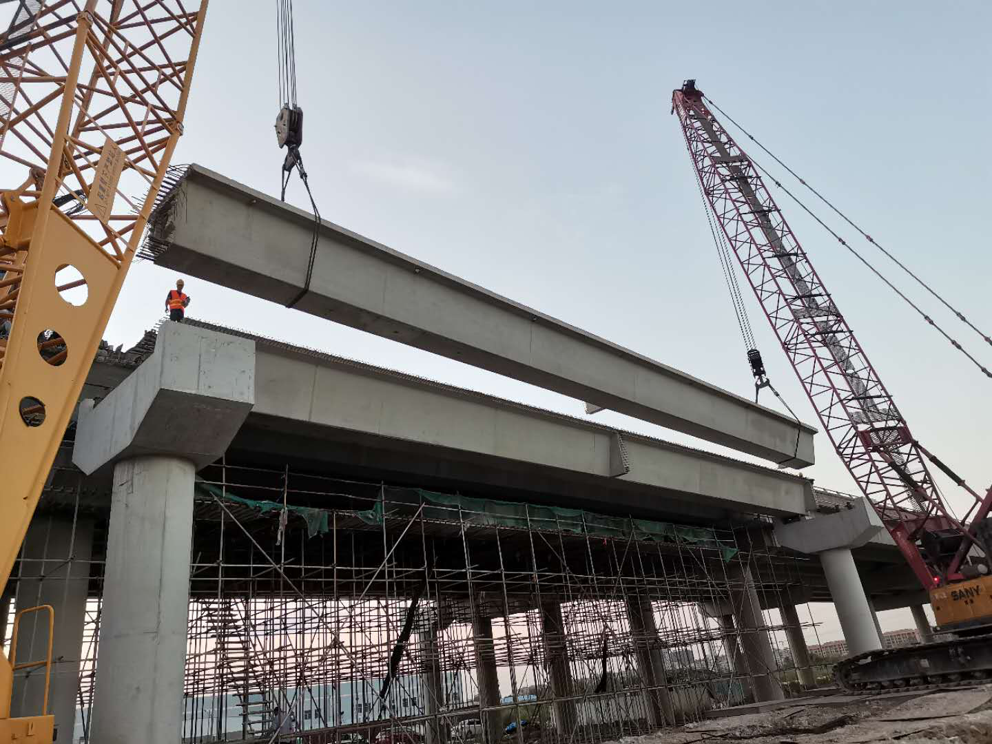 因箱梁架设需对连霍高速既有桥梁防撞墙、翼缘板进行破除,需对既有高速实施封闭施工交通管制,封闭时间从8月27日起至12月31日。为保障本市旅游业及港口关联企业生产经营不受连霍高速新墟互通新增匝道施工影响,市交通千亿app最新版下载,千亿(中国)调整交通组织方案,由全幅封闭改为半幅封闭半幅借道通车模式,给工程进度管理以及施工安全带来较大困难。为了确保年底建成这一工期目标,交通千亿app最新版下载,千亿(中国)组织参建单位研究细化施工方案,结合项目施工的特点,增加一倍架梁设备,这将有效缩短架梁施工周期。
