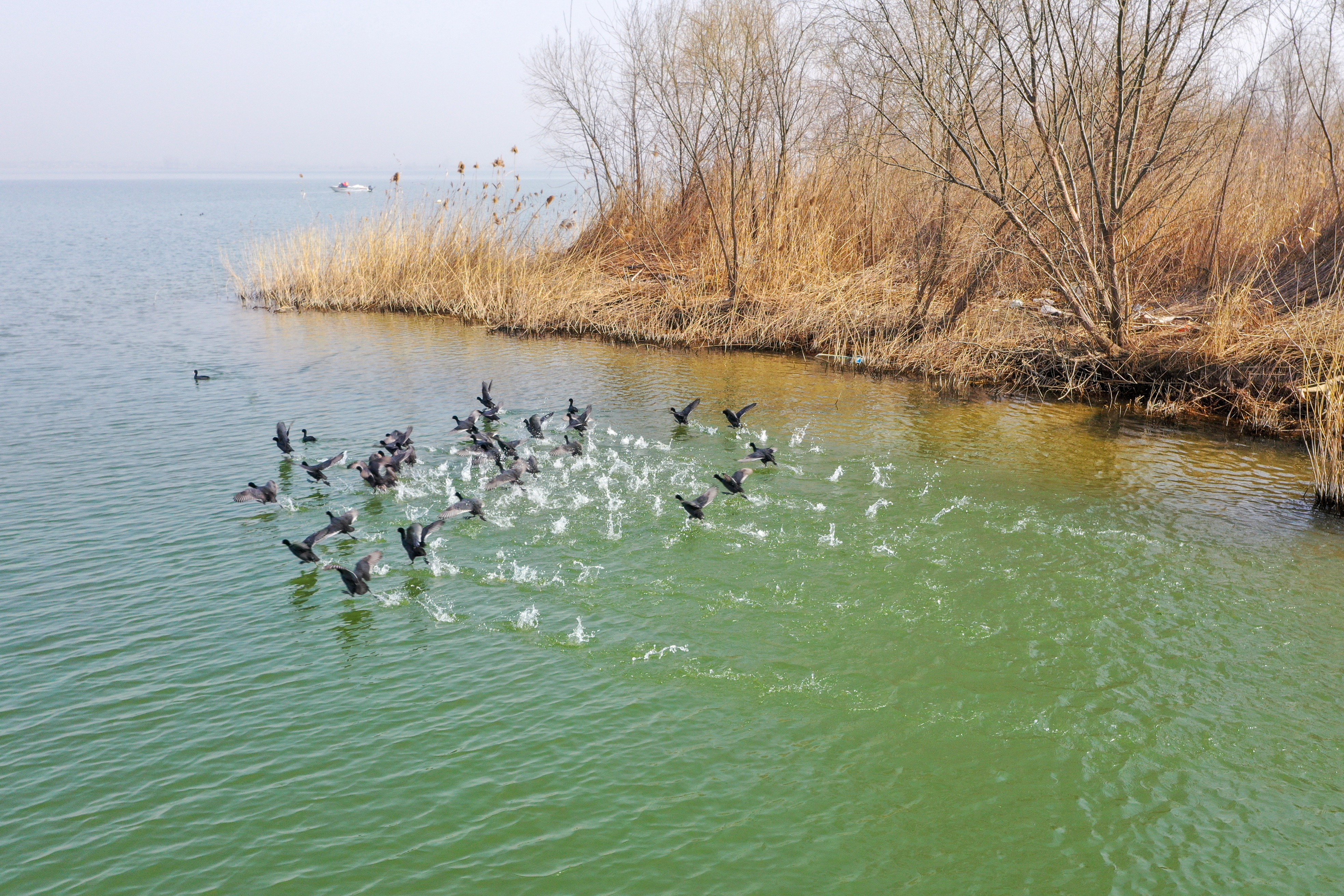 3月5日,时值惊蛰,万物春和景明,在石梁河水库,一群悠闲轻盈的野鸭带着春意跃动而起,时而停驻,时而追逐。