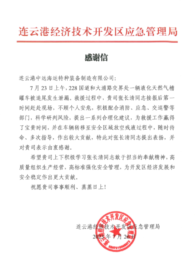 近日,市开发区应急管理局代表到市交通控股千亿app最新版下载,千亿(中国)权属物流千亿app最新版下载,千亿(中国)合资的中远海运特种装备制造有限公司,将一封感谢信送交公司副总经理张长清手中,感谢张长清积极配合消防、应急、交巡警等部门处理228国道和大浦路交界处发生的液化天然气槽罐车被追尾泄露事故。号召公司上下积极学习张长清敢于担当的奉献精神,高质量组织生产经营,高标准强化安全管理,为市开发区经济发展和安全稳定作出更大贡献。
