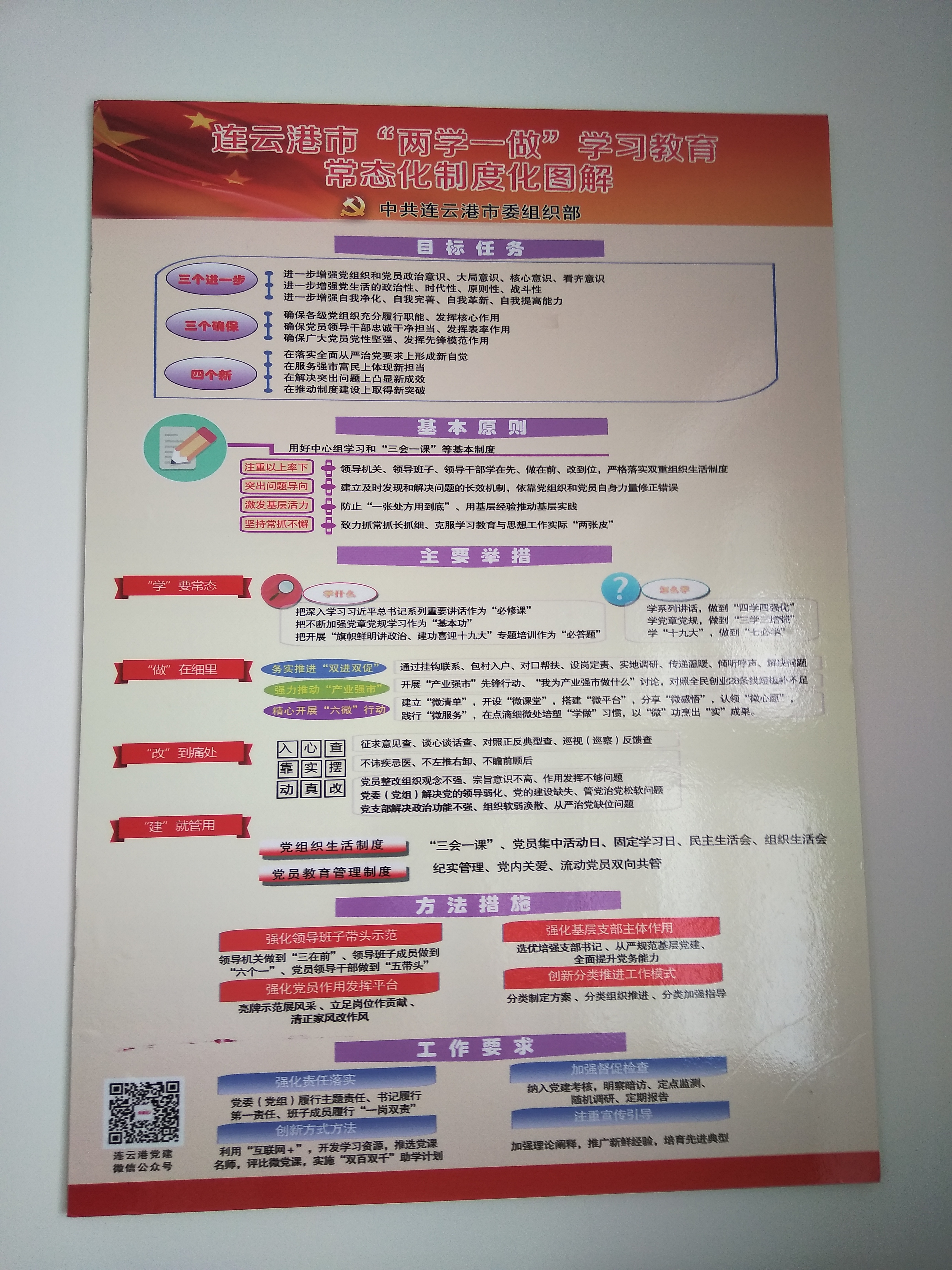 为确保“两学一做”学习教育活动常态化,保证各党支部明确学习教育怎么抓、党员怎么学、问题怎么改等问题,根据交通控股千亿app最新版下载,千亿(中国)党委要求,江苏海通通仁分公司党总支在党员活动室张贴连云港市“两学一做”学习教育常态化制度化图解,挂图围绕学习教育活动,逐一细化分解,确定了“两学一做”活动的目标任务、基本原则、主要举措、方法措施、工作要求等五个大类25小项重点内容,让每个党支部、每位党员做到心中有数,都有一本“明白账”,切实把学习教育各项工作做细做实做到位,确保学习教育深入人心,形成常态机制。