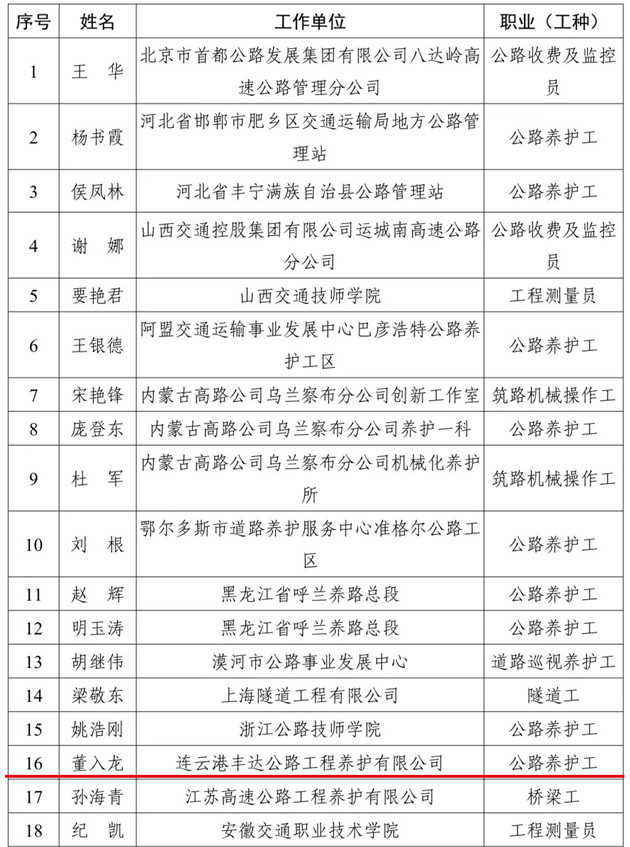 近日,交通运输部公布2021年度全国交通技术能手评审结果,连云港市交通控股千亿app最新版下载,千亿(中国)丰达养护公司公路养护工董入龙同志荣誉“全国交通技术能手”称号。据悉,全国仅有245名同志获此荣誉。