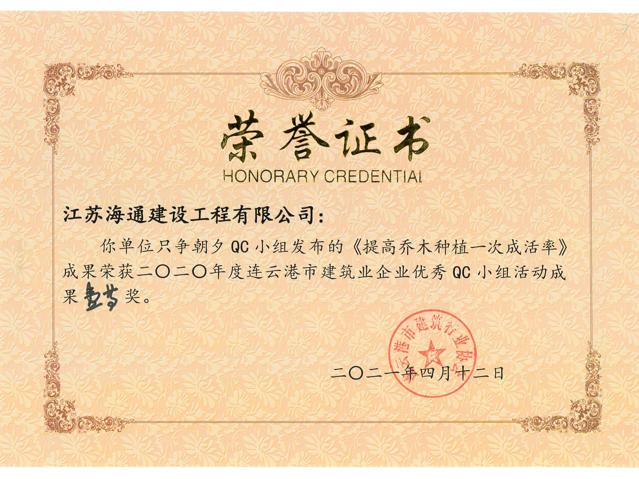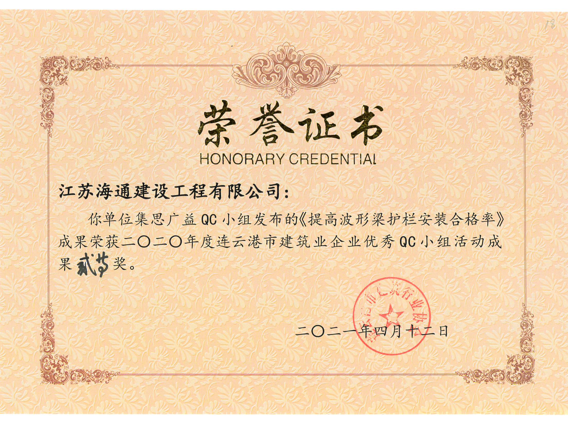 近日,连云港市建筑行业协会公布了2020年度连云港市建筑业企业优秀QC小组活动成果奖。江苏海建公司只争朝夕QC小组的成果《提高乔木种植一次成活率》荣获一等奖,集思广益QC小组的成果《提高波形梁护栏安装合格率》荣获二等奖。