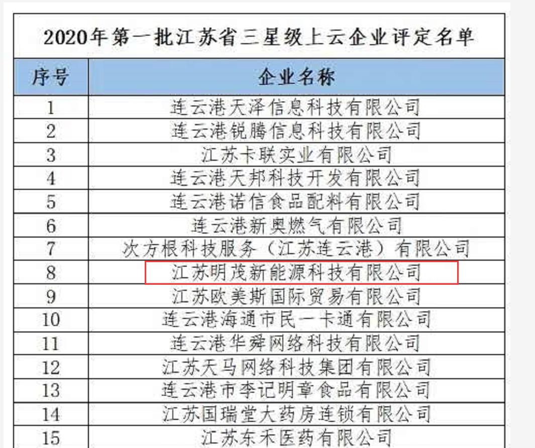 日前,明茂新能源公司顺利通过江苏省三星级上云企业评定工作。这是该公司落实《省政府关于深化“互联网+先进制造业”发展工业互联网的实施意见》和省工信委要求,提升企业管理结出的又一成果。