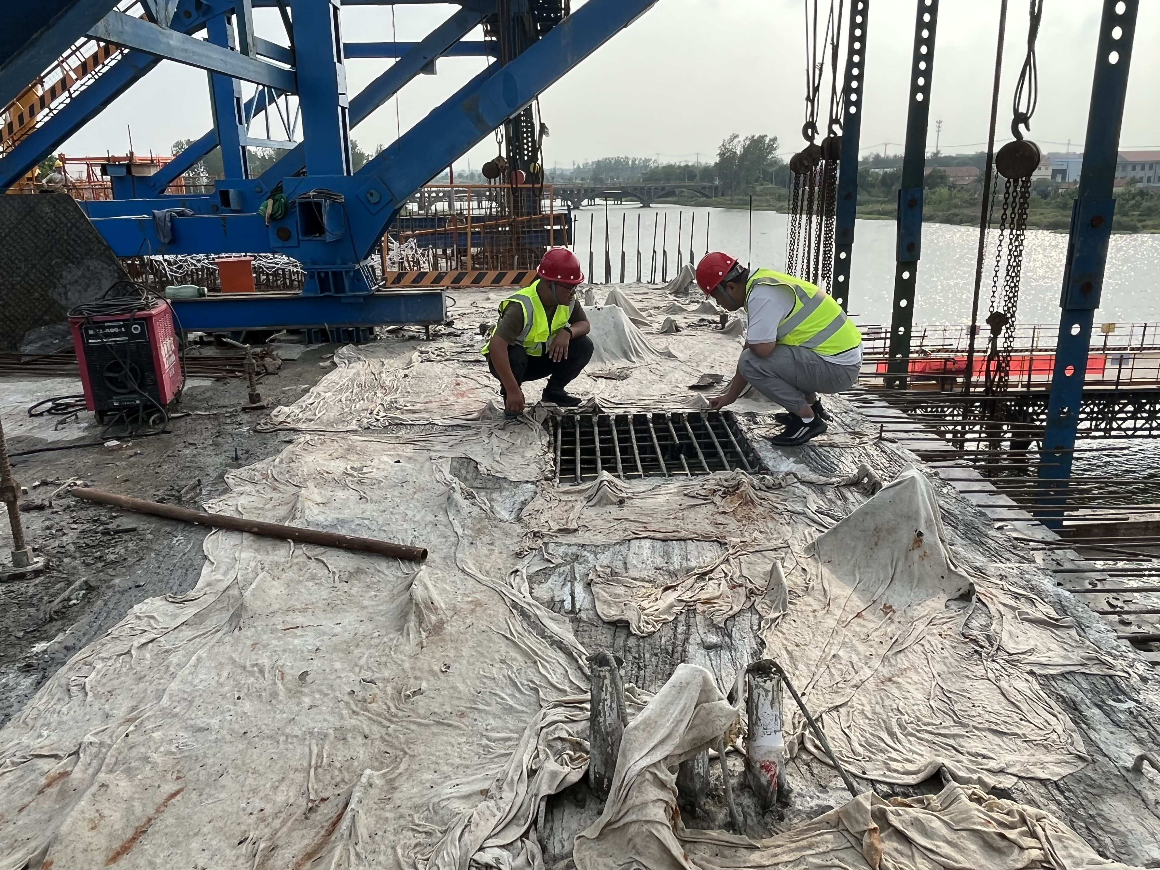 在S402赣榆南环段(G228-G204)路基桥涵工程沭北运河大桥施工现场,工人们正在进行上部结构预应力混凝土连续箱梁施工。浇筑混凝土前,施工人员对所用设备、机具进行严格调式,充分组织准备;浇筑过程中,从钢筋定位绑扎、预应力管道定位、模板打磨安装固定到混凝土浇筑,每一道工序均由现场管理人员进行旁站监督,严格按照图纸及规范要求施工,工序转换前严格执行“三检制”,确保工序合格。经过作业人员6个小时认真合理布料、振捣换来了第五联第三跨的成功浇筑。