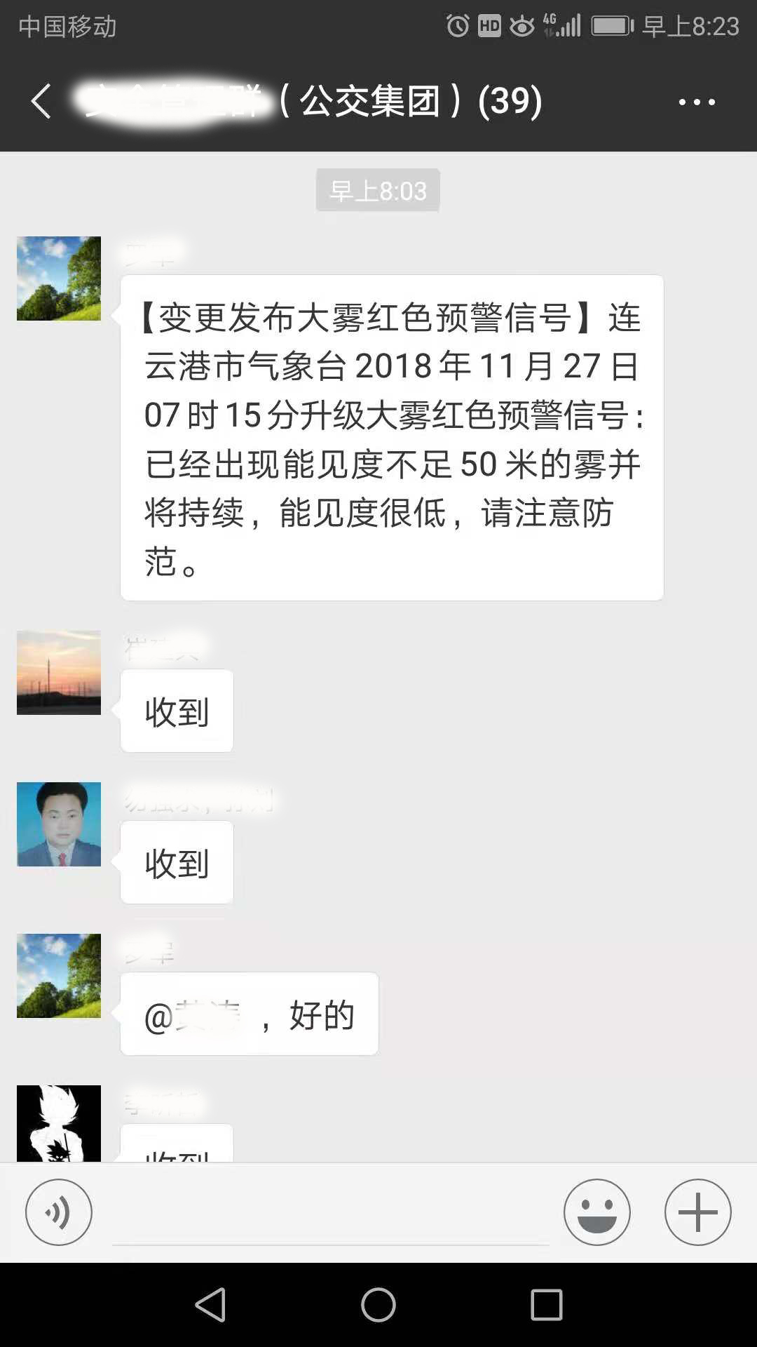 连云港市气象台2018年11月27日07时15分升级大雾红色预警信号:已经出现能见度不足50米的雾并将持续,能见度很低,请注意防范。
