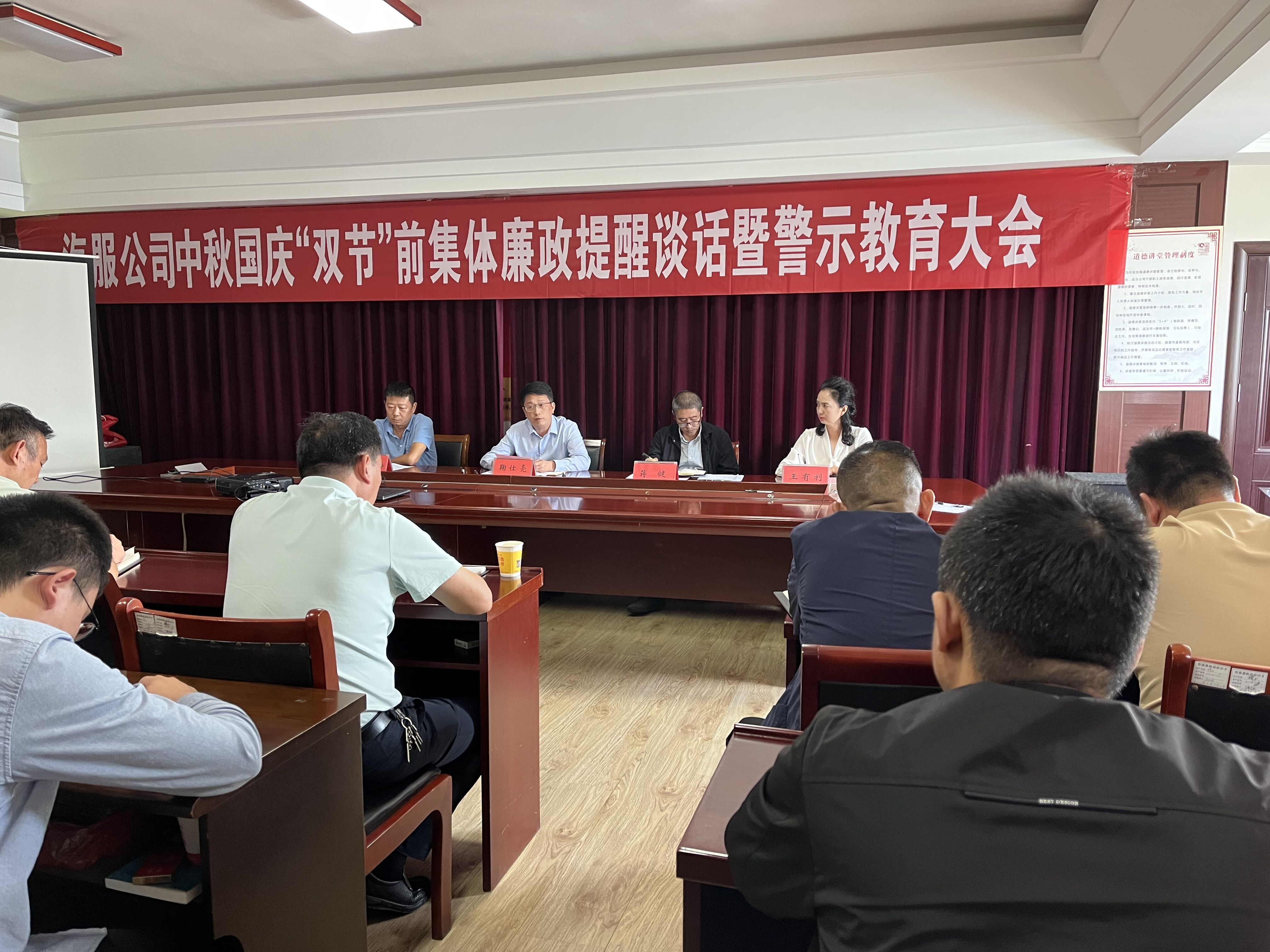 “中秋”“国庆”双节将至,为营造风清气正、崇廉尚俭的节日氛围,防止“四风”反弹,进一步落实中央八项规定精神,守住“底线”,不触“红线”,筑牢“防线”,9月27日上午,汽服公司召开中秋国庆“双节”前廉政谈话会暨廉政警示教育大会。公司党委副书记、常务副总经理蒋健主持会议,公司领导班子成员、全体中层干部参加会议。