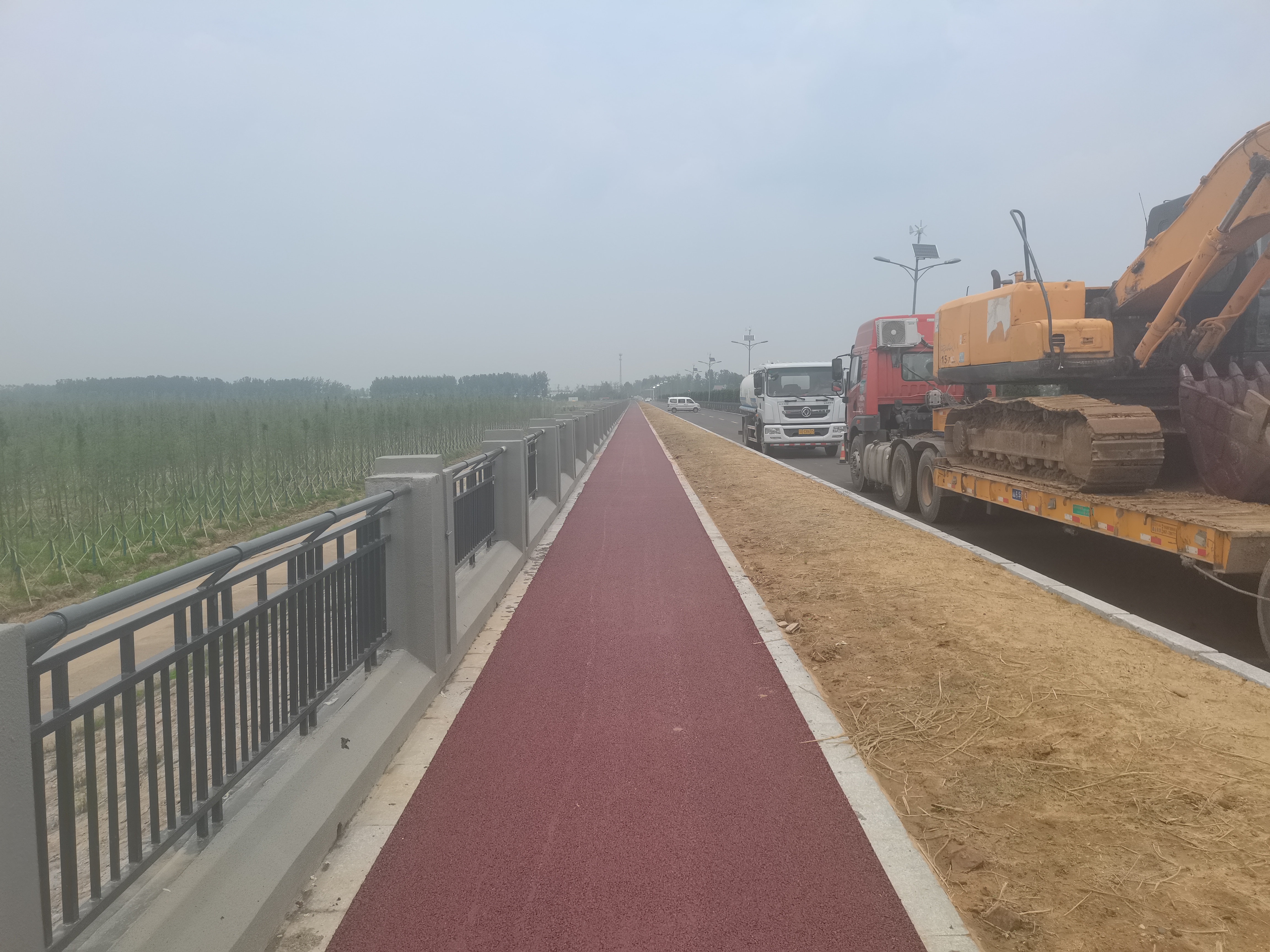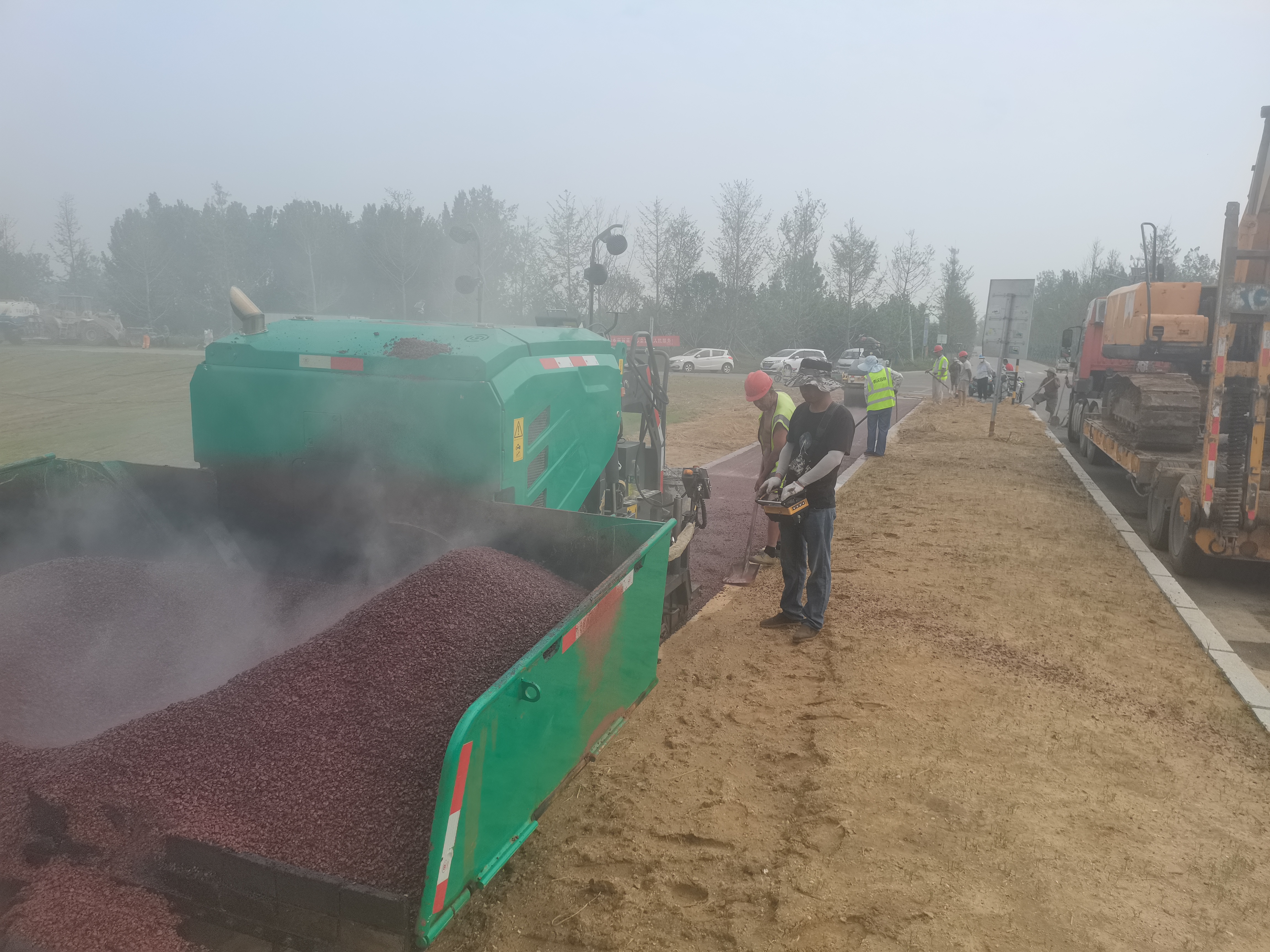 在彩色沥青施工过程中采用流水操作,技术人员配合合理,机械调配得当,且机械工人操作娴熟,整体段落于当日下午完成施工。