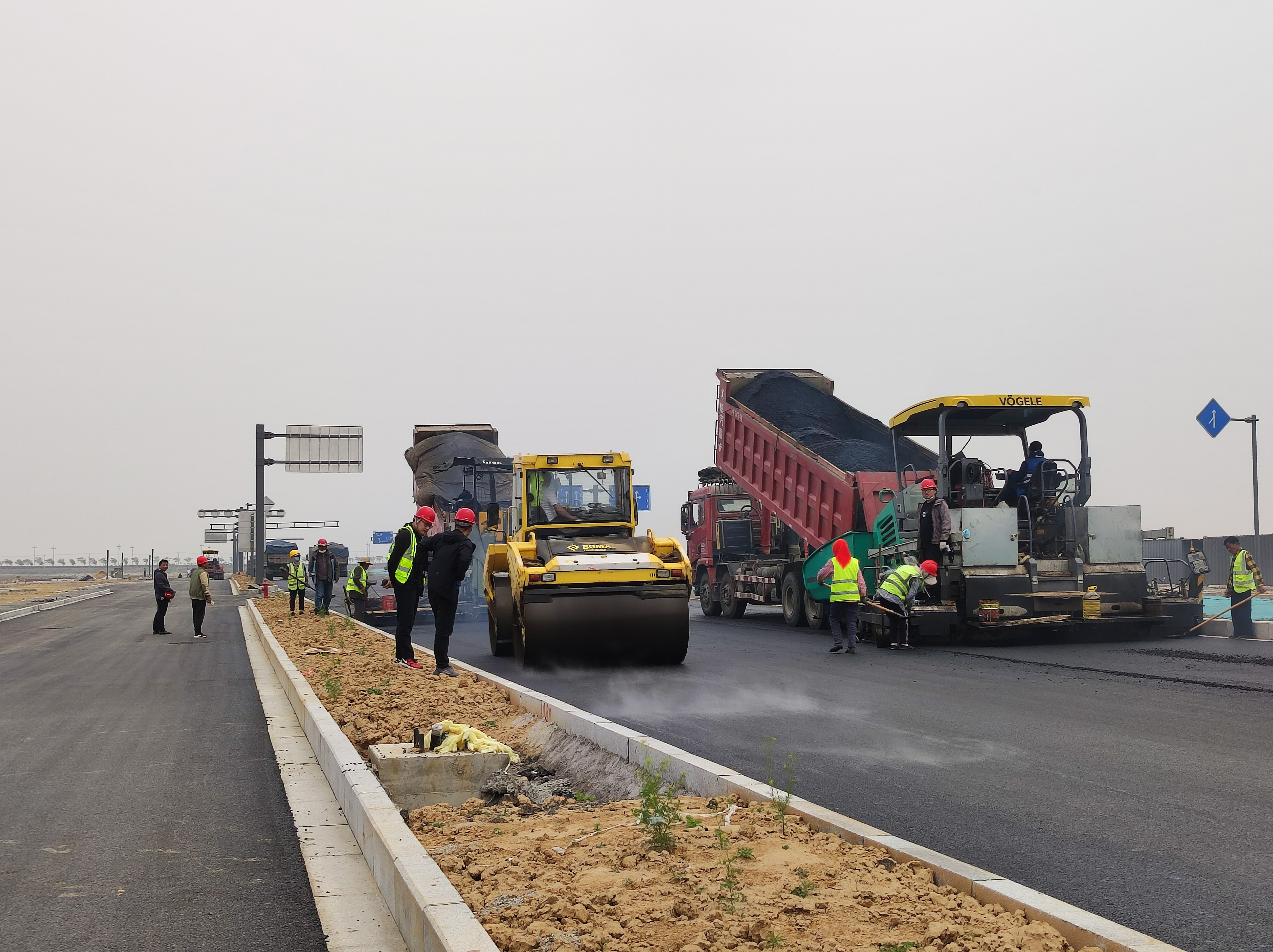 汇晶路项目目前正在进行道路沥青的摊铺,大型压路机、挖掘机、沥青摊铺机等工程机械来往穿梭,施工人员正在对刚刚铺设完的路面进行平整、清理。汇晶路设计标准高,施工工艺要求严,建成后,将为周围群众生产、生活的出行提供极大方便。