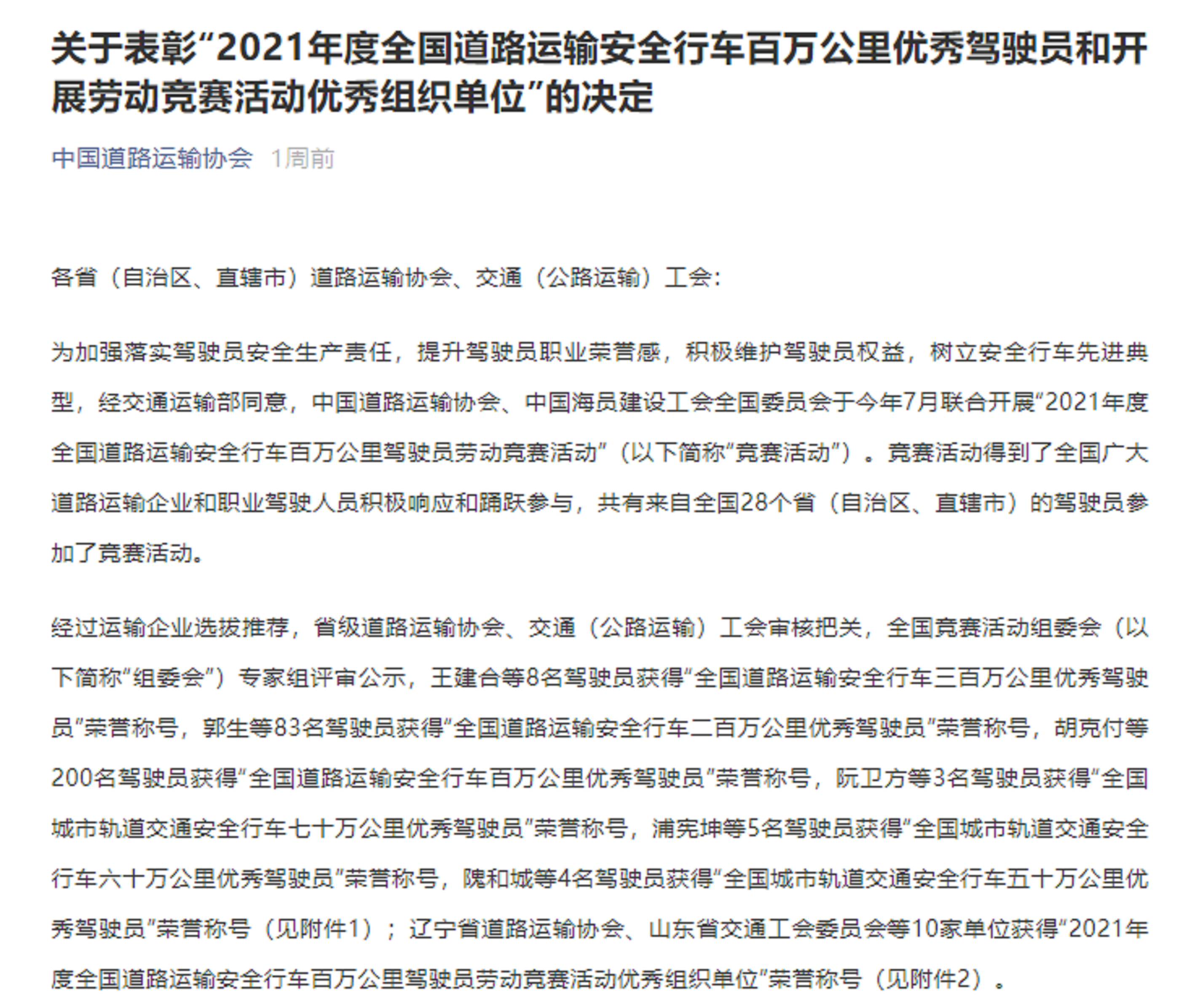 据了解,全国道路运输安全行车百万公里劳动竞赛活动是经交通运输部同意并指导,由中国道理运输协、中国海员建设工会全国委员会联合举办的活动,共有来自全国24个省(市、自治区)的驾驶员参加。该活动旨在弘扬“生命至上,安全第一”的理念,展现中国特色社会主义新时代道路运输从业人员的新作为,树立安全行车先进典型,发挥示范引领、模范带头作用,推动落实道路运输安全工作水平,推进平安交通建设。
