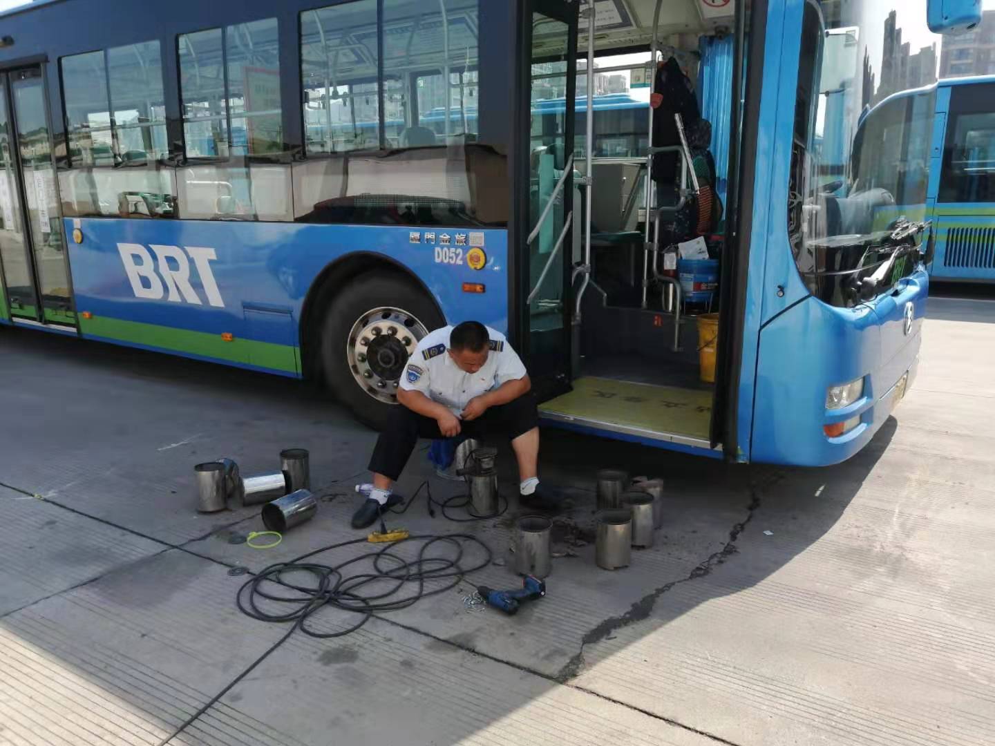 公交车是人员密集的场所,在公交车上配置灭火器是为了保护车辆与人员安全的一项重要措施。公交千亿app最新版下载,千亿(中国)快速公交事业部在大检查中偶然发现,纯电动车车载灭火器的底部有不同程度的生锈腐蚀,为了灭火器在紧急情况下能够发挥应有的作用,只能对一些底部腐蚀严重的灭火器进行更换。