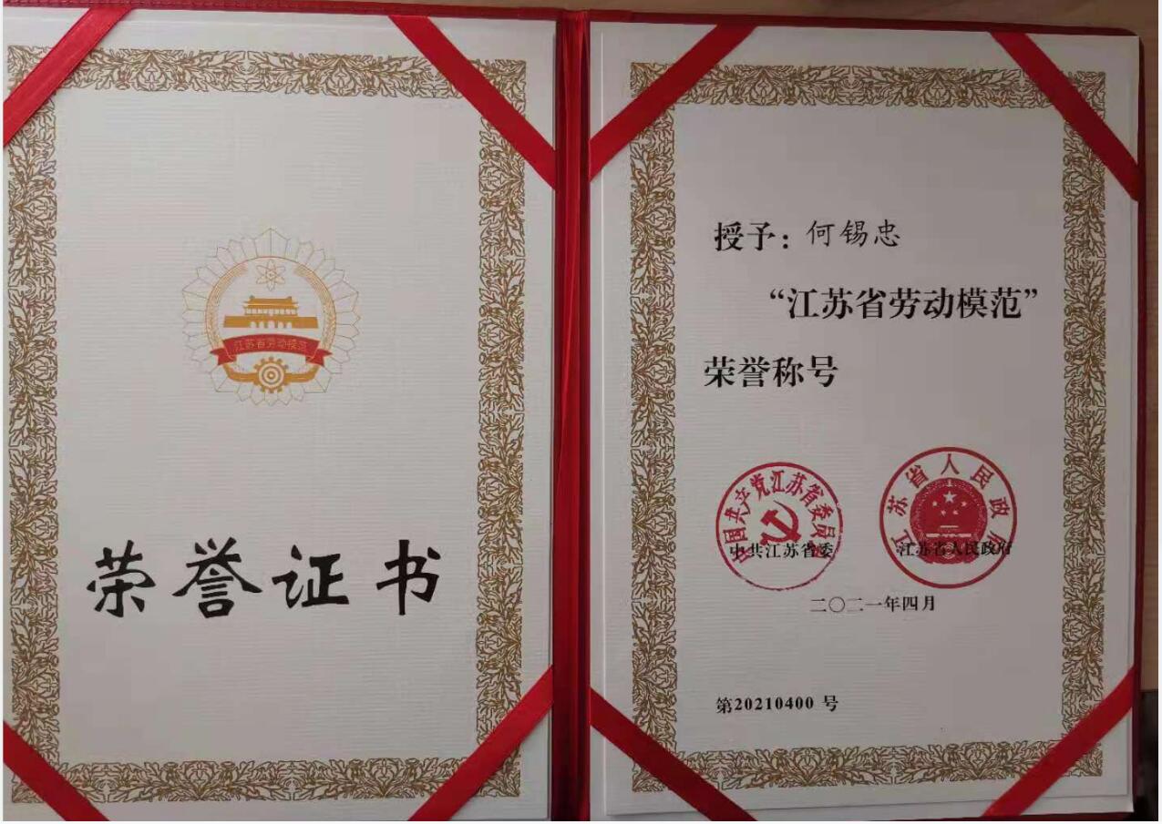 为进一步弘扬当代工匠精神,营造全省人民争劳模、学劳模的良好氛围,2021年,中共江苏省委员会和江苏省人民政府联合在全省范围内开展2021年江苏省劳动模范和先进工作者推荐评选工作。本着公开、公平、公正的原则,经基层单位推荐、专家评比、社会监督。近日,何锡忠同志被授予“江苏省劳动模范”荣誉称号。